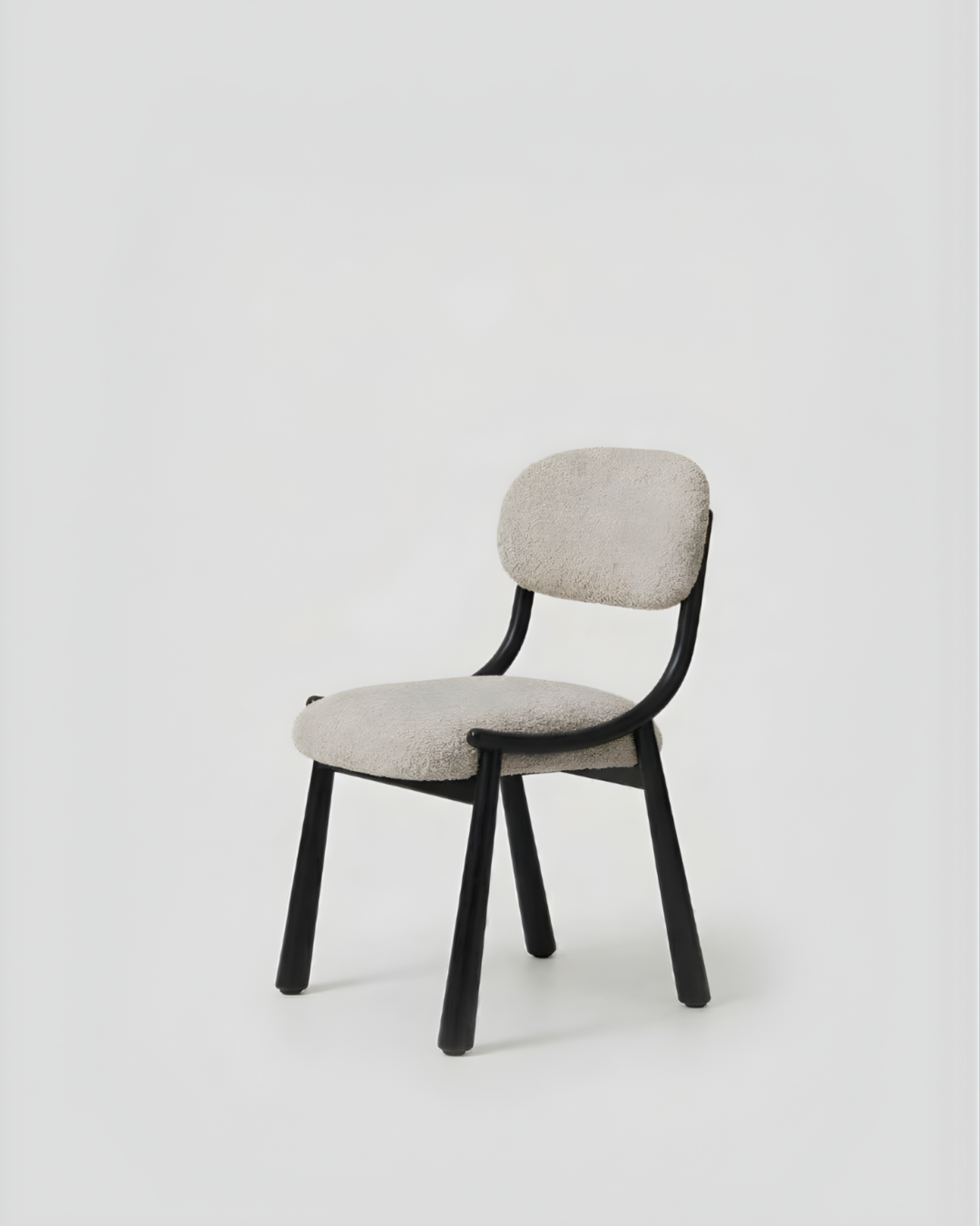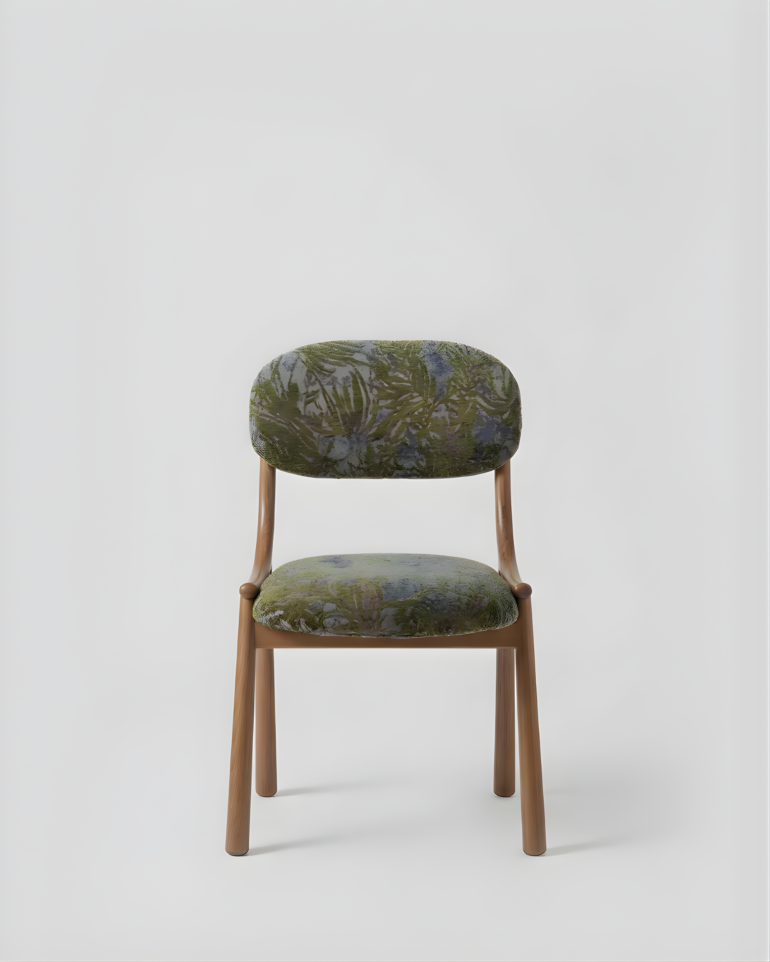 Wood and upholstery meet in quiet harmony, neither dominating the other. Its gentle curves and grounded stance encourage ease and moderation—supportive without excess, refined without restraint.