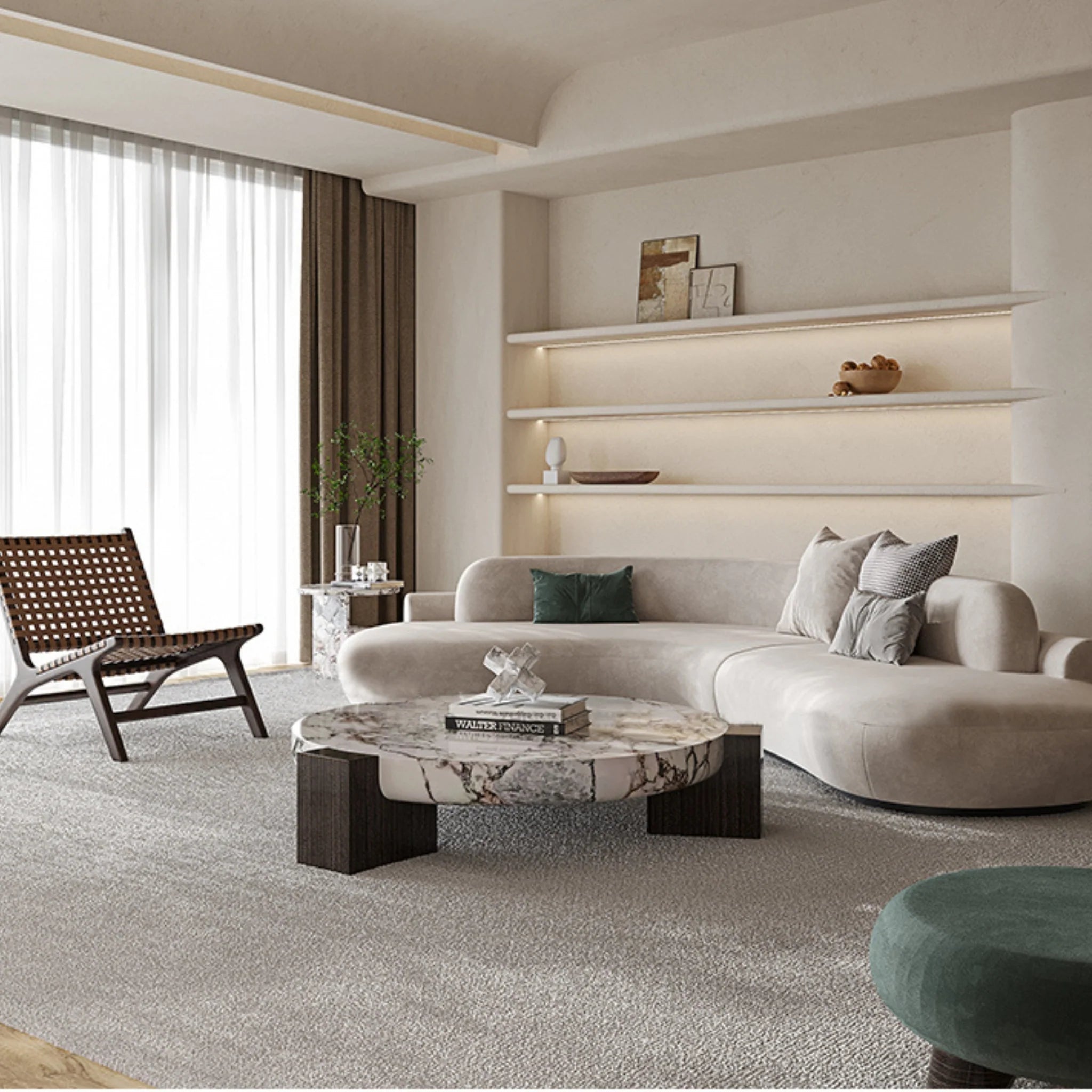The Matteo Coffee Table merges natural stone with timeless design. Its thick curved natural stone top rests gracefully on three sturdy wooden legs, creating a sculptural centerpiece that balances strength, serenity, and artisanal craftsmanship.